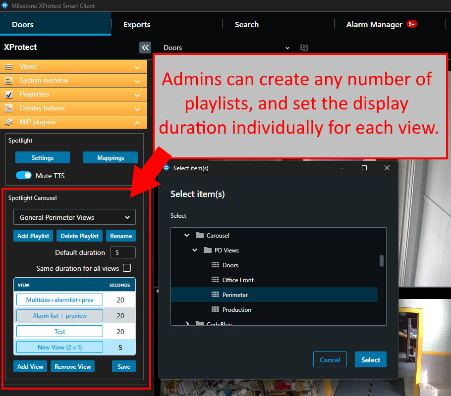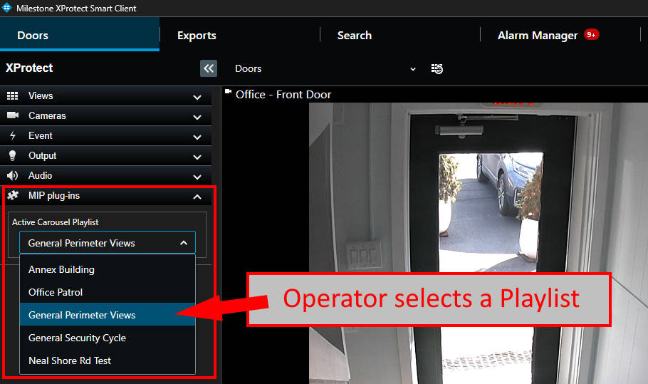 Any number of playlists can be created, and Smart Client operators can select from a dropdown to quickly switch between pre-defined playlists.