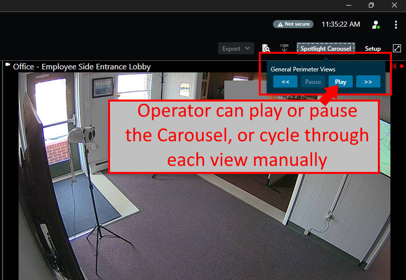 If an operator views something of interest, Mixtape can be paused to keep the current view on-screen. Optionally, the operator can manually cycle through a previous view. Once the alarm has been reviewed, the operator presses "Play" to resume the regular view cycle.